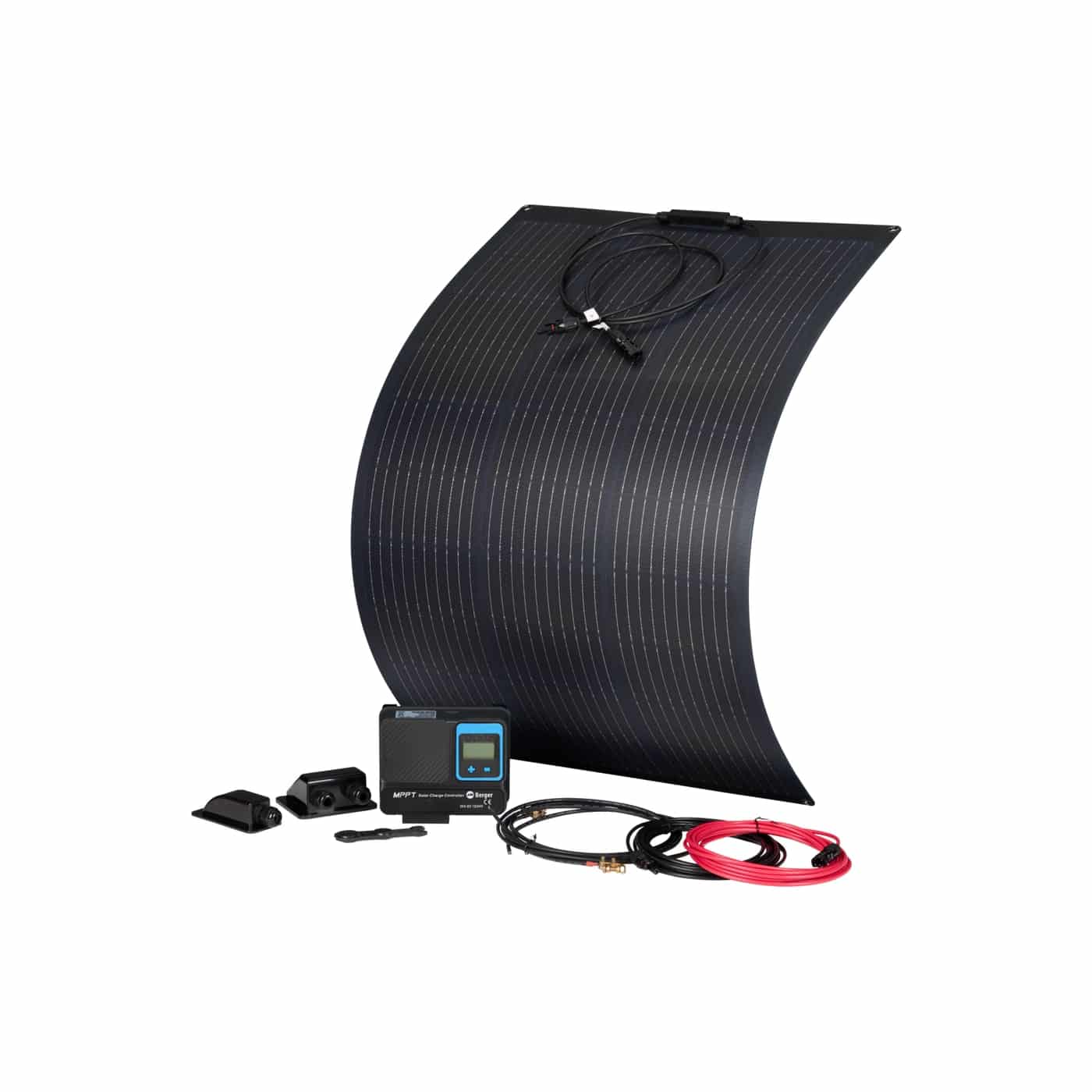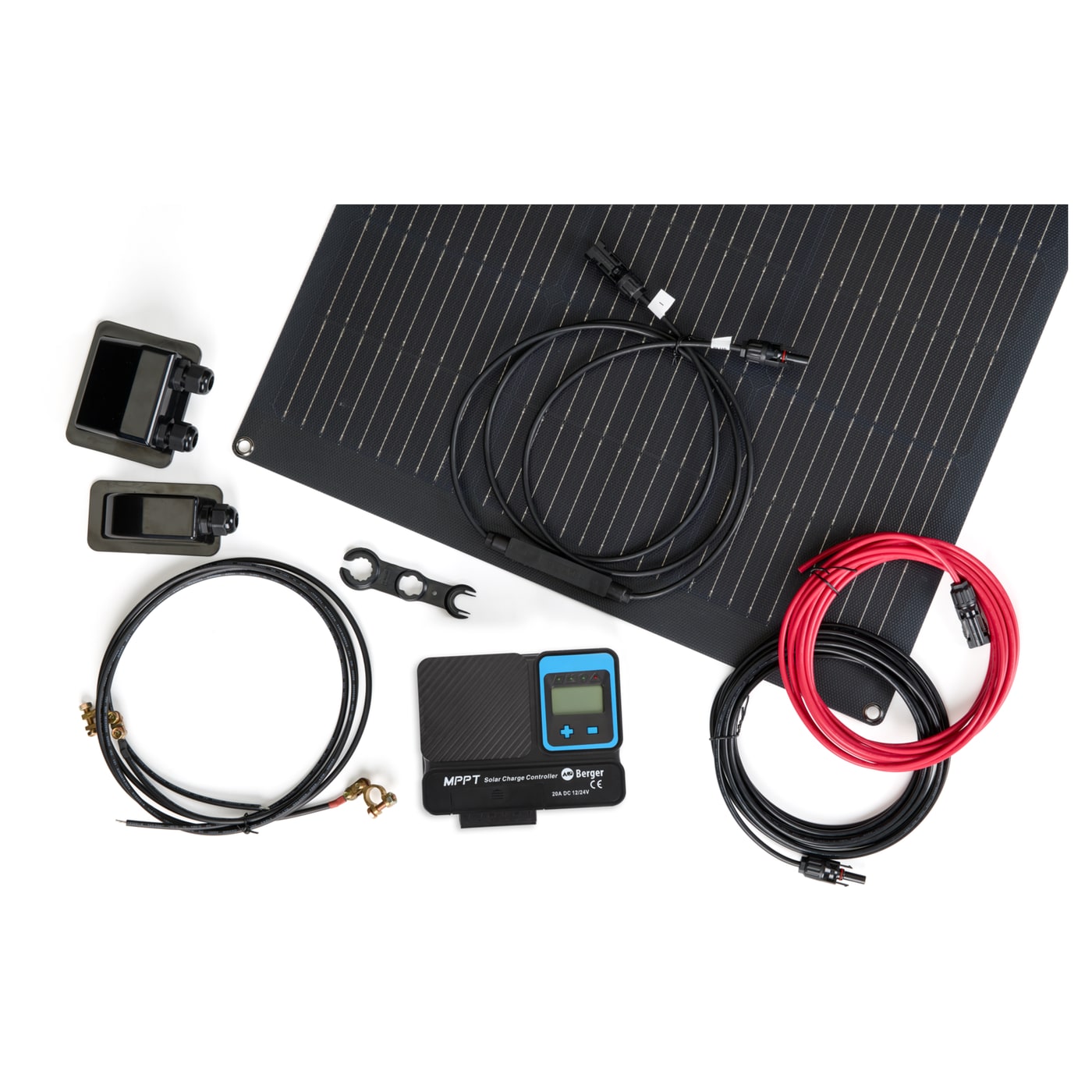 Täydellinen Berger Deluxe Flex 100 W aurinkopaneelisarja. Sisältää taipuisan paneelin, säätimen ja asennustarvikkeet. Helppo tapa saada sähköä retkeilyautoon!