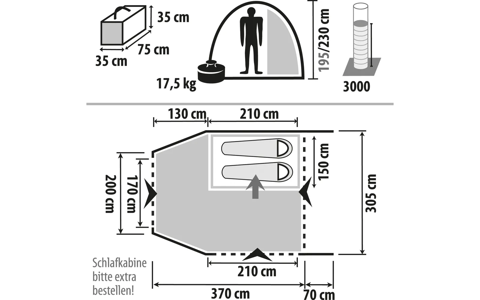 | Toimitussisältö | Telttakangas, 3 ilmaputkea, 2 teräspaalua, kaarirauta, ilmapumppu, kiinnityssarja, pakkauspussi (100 % polyesteri) |