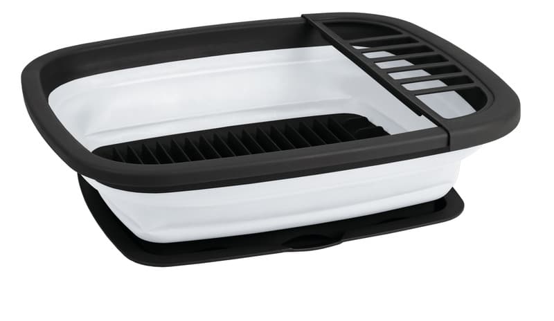 Tämä teline on suunniteltu erityisesti matkailuajoneuvoihin ja veneisiin. Avattuna se on reilun kokoinen (50 x 42 cm), joten siihen mahtuu isonkin aterian tiskit. Pystytapit pitävät lautaset tukevasti pystyssä, ja erilliset lokerot pitävät haarukat ja veitset järjestyksessä. Telineen nerokkuus piilee sen rakenteessa: silikoniseinämät painuvat kasaan, jolloin koko teline madaltuu vain 6 cm korkeaksi. Mukana tuleva (tai pohjassa oleva) irrotettava tippukaukalo/alusta kerää veden, joten voit kuivattaa astiat missä tahansa – vaikka olohuoneen pöydällä – kastelematta pintoja.