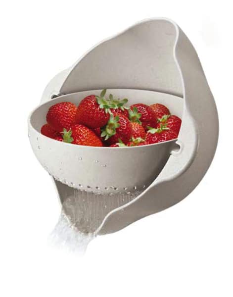 Tämän kulhon salaisuus on sen gyroskooppinen kiertomekanismi. Sisempi siiviläosa on kiinnitetty ulompaan kulhoon tavalla, joka antaa sen liikkua vapaasti painovoiman mukaan. Kun kallistat kulhoa kaataaksesi veden pois, sisempi siivilä pysyy automaattisesti pystysuorassa. Vesi valuu reunan yli, mutta ruoka pysyy turvallisesti korissa. Se on kuin taikuutta, mutta kyse on vain fiksusta rakenteesta!
