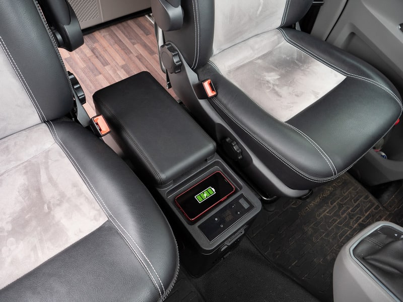 Kapea 8 litran kompressorijääkaappi 12V/24V järjestelmiin. Sopii täydellisesti etuistuinten väliin (VW T5/T6). Sisältää langattoman latauksen ja USB-portit.