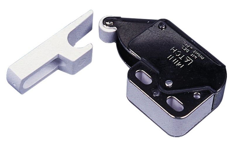 Kätevä Reimo Mini-Latch -automaattisalpa. Painallusmekanismilla toimiva lukitus retkeilyauton kaappeihin – mahdollistaa vetimettömät ovet.