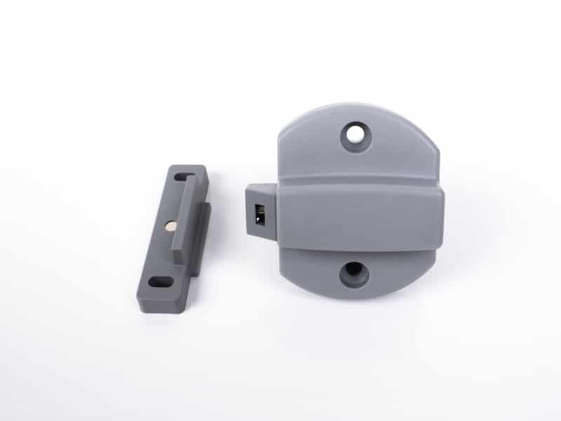 Edistyksellinen Reimo Push-Lock -magneettisalpa. Yhdistää mekaanisen lukituksen ja magneetin varmuuden retkeilyauton kaappeihin.