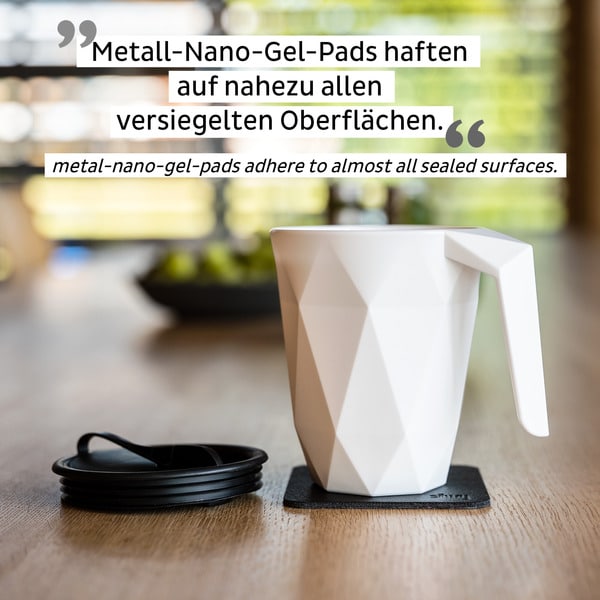 Tämä setti on ”All-in-One” -ratkaisu. Se sisältää korkealaatuisen muovimukin integroidulla magneetilla, tiiviin kannen pilliaukolla sekä metallisen nano-geelialustan (musta). Kun asetat mukin alustalle, se napsahtaa kiinni ja pysyy pystyssä kovemmassakin töyssyssä. Alusta tarttuu lähes mihin tahansa pintaan – pöytään, kojelautaan tai käsinojaan – ja se on pestävä sekä uudelleenkäytettävä. Muki itsessään on valmistettu huipputeknisestä, BPA-vapaasta muovista, joka eristää lämpöä paremmin kuin lasi, ei särky pudotessaan ja on miellyttävä kädessä.