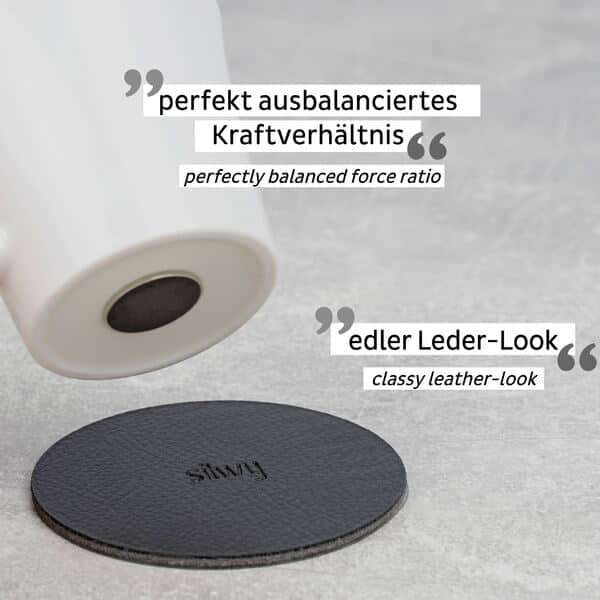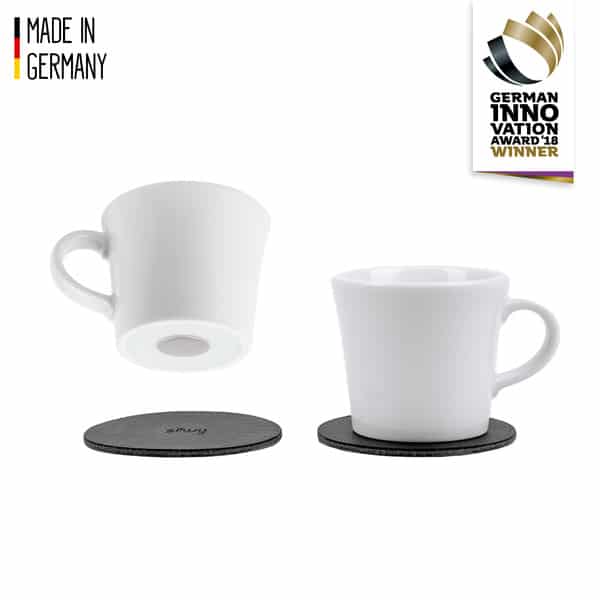 Kuppien salaisuus on pohjaan huomaamattomasti integroitu magneetti. Kun asetat kupin mukana tulevalle metalliselle nano-geelialustalle, se pysyy vakaasti paikallaan vaikka pöytä olisi vinossa tai meri kävisi. Alustat tarttuvat lähes mihin tahansa pintaan, ne ovat pestäviä, siirrettäviä eivätkä jätä jälkiä. Koska magneetin voima on säädetty täydelliseen tasapainoon, kuppi on helppo nostaa juodessa, mutta se ei kaadu itsekseen.