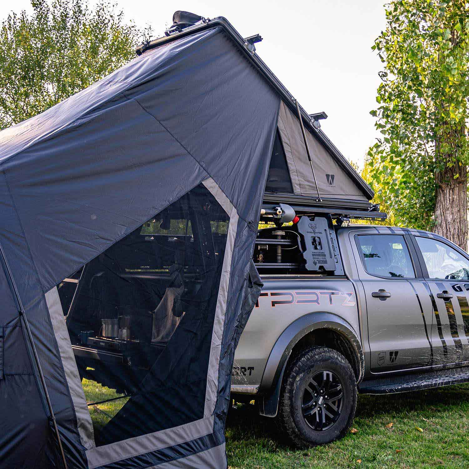 Vickywood CUMARU LIGHT 152 kattoteltan lisähuone, harmaa tuo kattoteltan yhteyteen suojaisan lisätilan varusteille, pukeutumiseen ja säänsuojaan. Sopii malliin CUMARU LIGHT.